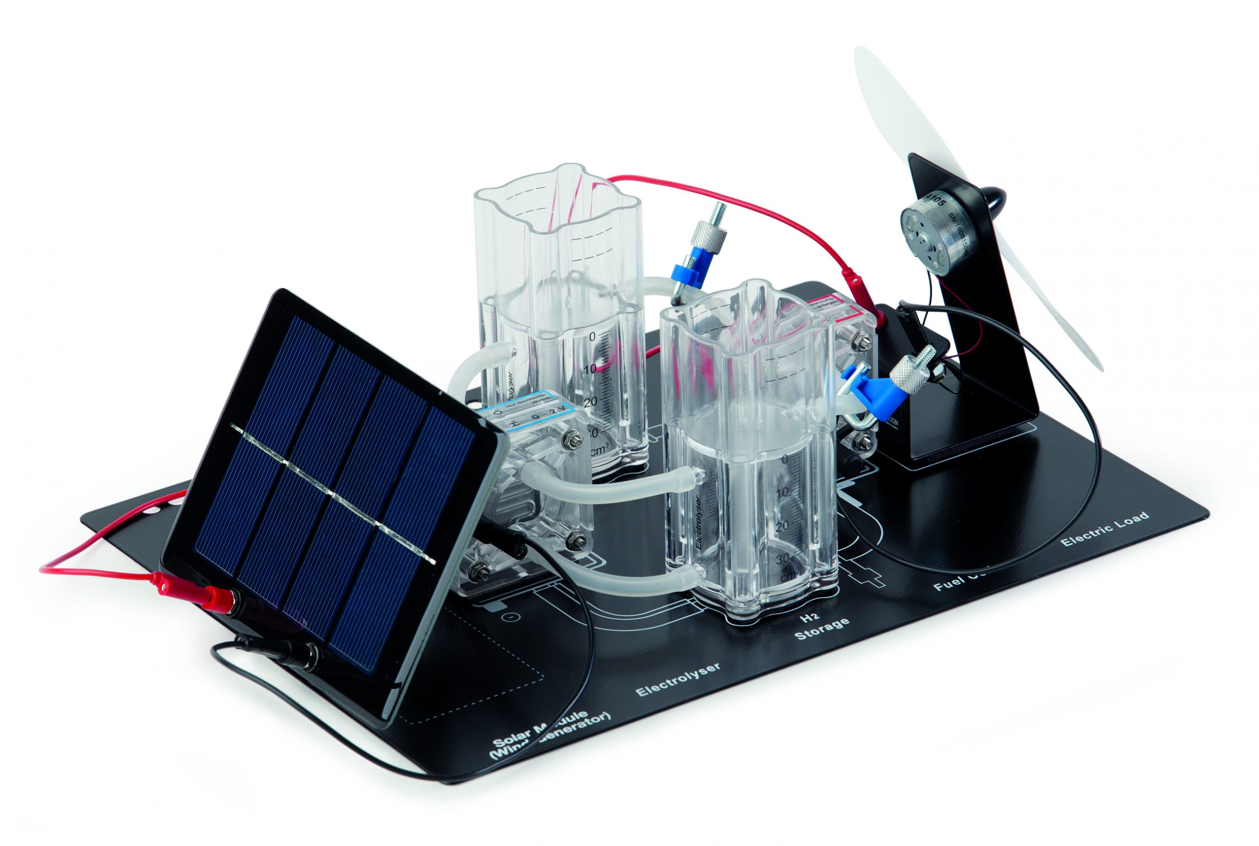 H-TEC Education's Junior Basic consists of solar module, PEM Electrolyzer, hydrogen and oxygen storage tanks, PEM fuel cell and fan